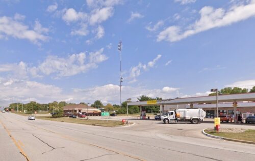 *GONE* (razed and removed) Along the east side of N. River Rd. (IN 43) north of I-65, by 0.5 mile. The barn was on the right side of the highway headed north from I-65. The Mail Pouch sign faced south. One end. Black background.