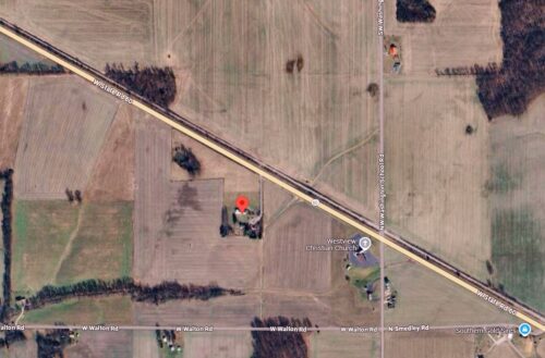 *GONE* (painted over) Along the southwest side of IN-60 southeast of the N. Marshall Rd. intersection, in Campbellsburg, by 1.4 miles. The barn is on the right side of IN-60 headed southeast away from Campbellsburg. The Mail Pouch sign faced north. One side. Red background.