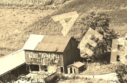 The barn, other buildings and the site configuration (Photos 2-4) are clearly visible in Historic Aerials' imagery (1965). The distance measurement tool was used to obtain the decimal coordinates of the Mail Pouch barn. The coordinates were input to the Google map program and the red pin on Photo 6 is the location where the barn was once located.