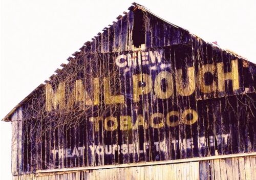 *GONE* (razed and removed) Along the south side of US-68, north of junction with KY-165 by about 2.1 miles. The barn was on the right side of the highway headed northeast. The Mail Pouch sign faced silghtly northwest. One end. Black background.