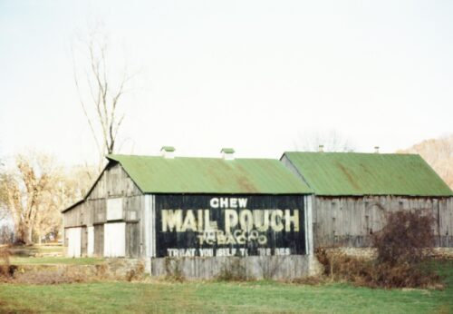 Along US Rt. 52/US Rt. 62 southeast of the Virginia St. intersection, in Ripley, by about 1.4 miles. The barn will be visible in the distance along the left side of the highway headed southeast. It will be necessary to drive further south along US Rt. 52/62 to view the Mail Pouch sign. For the best view, turn left onto Co Hwy 1008 (Elk River Rd) and the barn willl be on the left side of the road. There are two Mail Pouch signs on the barn. One sign is clearly visible on the southeast side of the barn. There is a sign on the southwest end of the barn which is very faded (almost *GONE*). Black backgrounds.