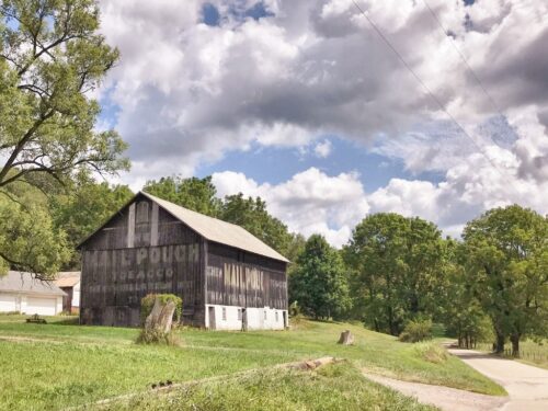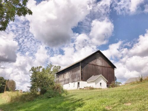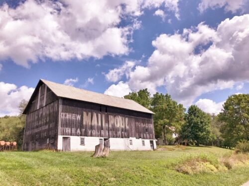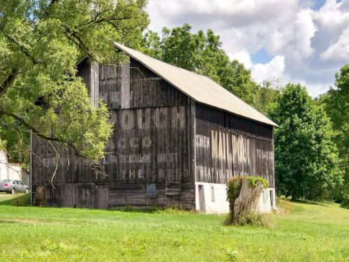TH-224 (Lemon Rd NW), just off of OH-43 (Canton Rd. NW) which is south of the intersection with OH-183 by about 0.6 mile. The barn is on the left side of Lemon Rd. headed east. One Mail Pouch sign faces west and the other Mail Pouch sign faces south. One end. One side. Black backgrounds.