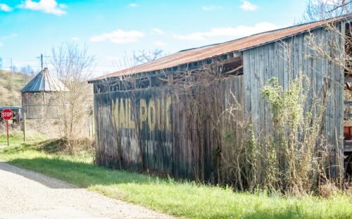 At the northwest corner of the OH-141/CR-153 junction. The Mail Pouch sign is on the east side of the barn (clearly visible from OH-141). Black background.