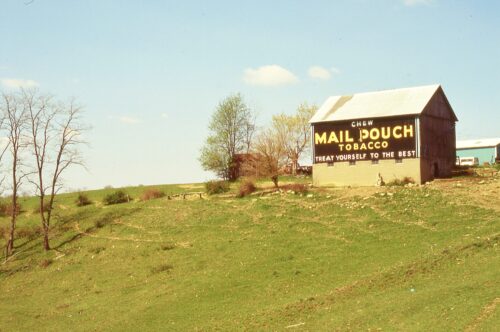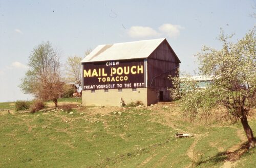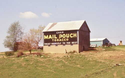 OH-26/OH- 800 south of OH-78 (W. Court St.) in Woodsfield, by about 1.25 miles. The barn is on the right side of the highway headed south from Woodsfield. The Mail Pouch sign faces southeast. One side. Black background.