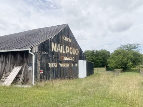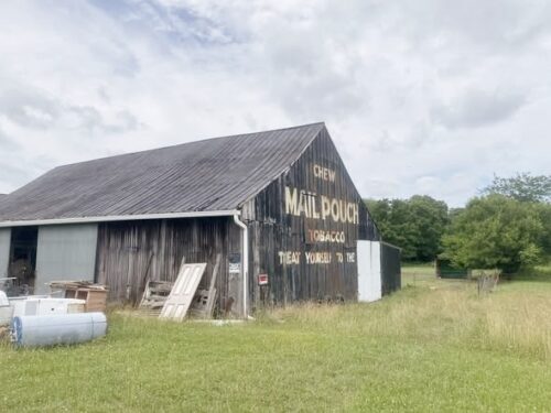 Orr Rd. north of intersection with US-23 by about 1.5 miles. The barn is on the left side of the highway headed north. The Mail Pouch sign faces north. One end. Black background.