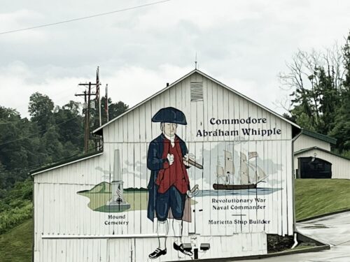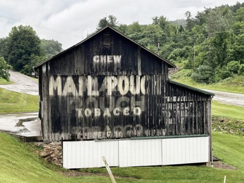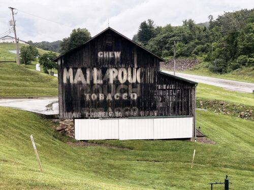 Along the southwwest side of OH-821, northwest of OH-60 by about 2.0 miles. The barn is on the left side of the road headed northwest. The Mail Pouch sign faces southeast. One end. Black background.