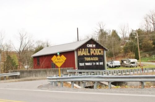 Coal Shed Rd. (Mann Rd.) southeast of Bellefonte. To access the barn: From PA Rt. 144 (S. Spring St.) & W. High St. intersection, in Bellefonte, head south on PA Rt 144. PA Rt. 144 is S. Spring St., then Pine St. & then Axemann Rd. Continue south from the intersection about 2.2 miles to Coal Shed Rd. (Mann Rd.) Turn right onto Coal Shed Rd. (Mann Rd.). The barn is immediately on the left after crossing the bridge. The MP sign faces northeast. One end. Black.