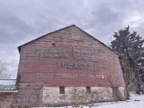 *GONE* (painted over) I-76 (PA Turnpike). East of exit 236 by about 3.5 miles; the barn is on the right side of the highway headed east. West of exit 242 by about 2.5 miles; the barn is on the left side of the highway headed west. The Mail Pouch sign faced north. One end. Red background.