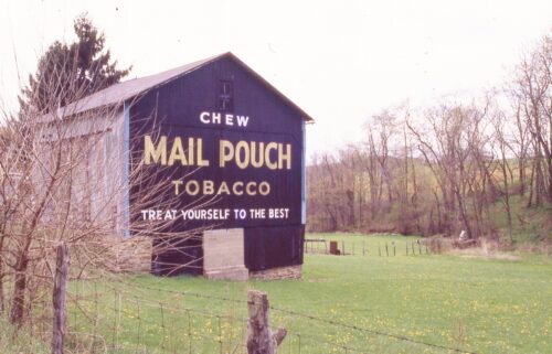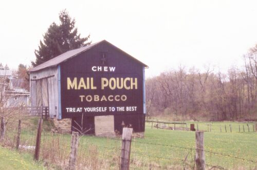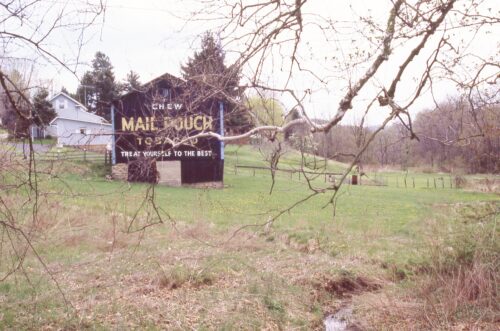 *GONE* (fallen. some rubble remains) US-40 (National Pike/W. Main St.) northwest of US-119, near Uniontown, by about 1.7 miles. The barn is on the left side of the highway headed northwest. The Mail Pouch sign faced northwest. One end. Black background.