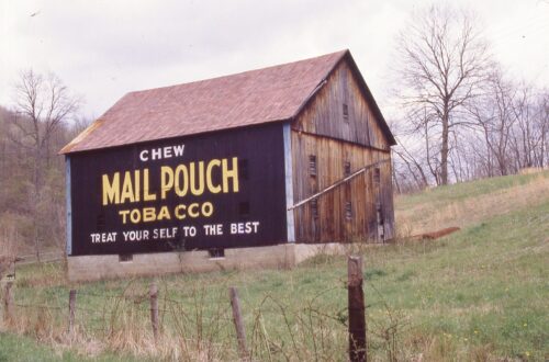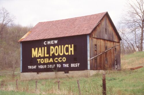 US-19 (Mt. Morris Rd.) south of PA-21 (E. Roy Furman Hwy.) intersection, in Morrisville, by about 12.2 miles. The barn is on the left side of the highway headed southeast. The Mail Pouch sign faces southwest. One side. Black background.