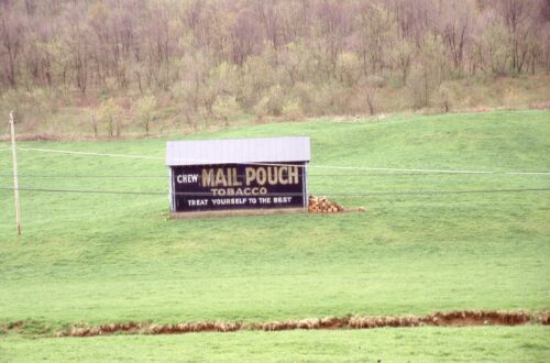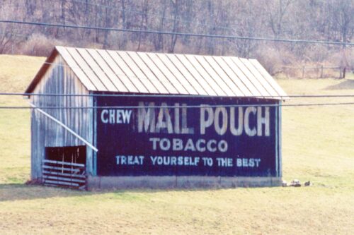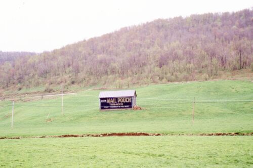 PA-18 (Golden Oaks Rd.) southwest of PA-21 (Roy Furman Hwy.) by about 1.3 miles. The barn is on the left side of the highway headed southwest. The Mail Pouch sign faces northwest. One side. Black background.