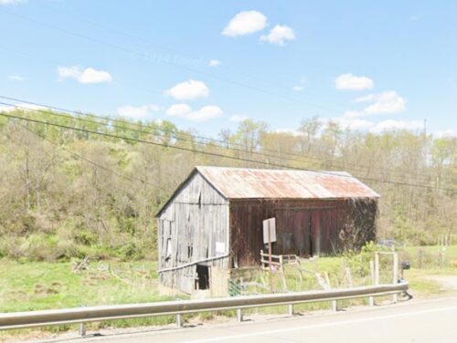 US-19 (Washington Rd.) north of PA-21 (W. High St.), in Waynesburg by about 4.7 miles. The barn is on the left side of the highway headed northeast. Two ends. Mail Pouch sign on the southwest end has faded away. Black background.