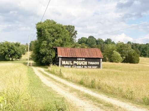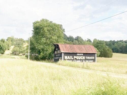 Along the southeast side of Ripley Rd. (WV-2) east of Viand St., in Point Pleasant by about 6.3 miles. The barn is on the right side of the highway headed east. Mail Pouch sign on the northwest side and on the northeast end. Kentucky Club sign on the southwest end. Black backgrounds.