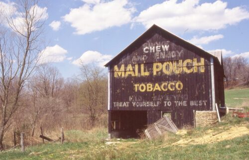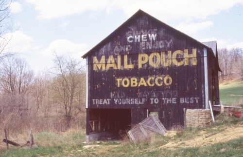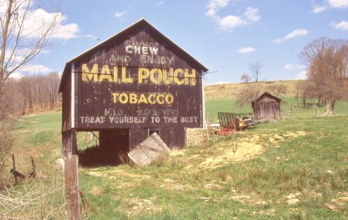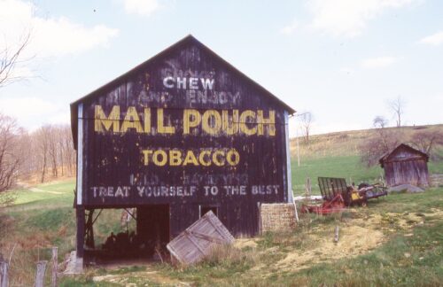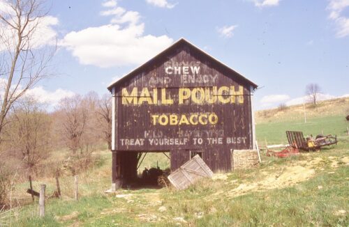 Along the northeast side of N Preston HWY (WV-26) south of I-68 exit 23 by about 2.2 miles. At about the 2.2 mile point south of I-68 there is a road that leaves the highway on the left side and enters a pasture beyond the trees. Take the road into the pasture, the barn is on the left side. The Mail Pouch sign faces south and is only visible driving north on WV-26. One end. Black background. Faded.