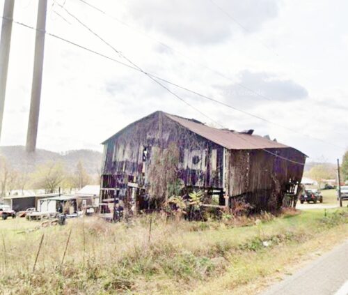 US Rt. 52 (Ohio River Scenic Byway), southwest of the Scioto Co. line by about 1.0 mile. The barn is on the left side of the highway headed southwest from Scioto Co. line. Two ends. Black background.