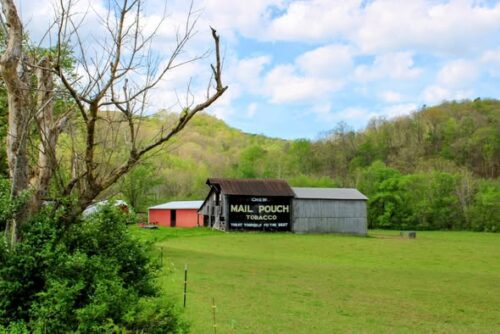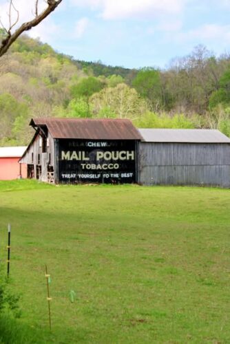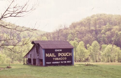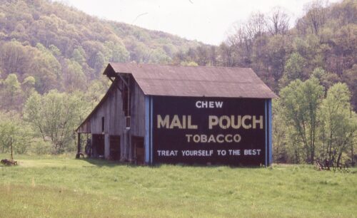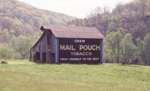 WV-14 (Palestine Rd.) south of WV-5, in Elizabeth, by about 8.6 miles. The barn is on the right side of the highway headed south. The Mail Pouch sign faces northeast. One side. Black background.