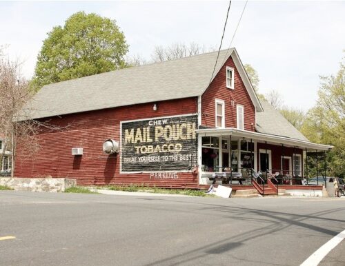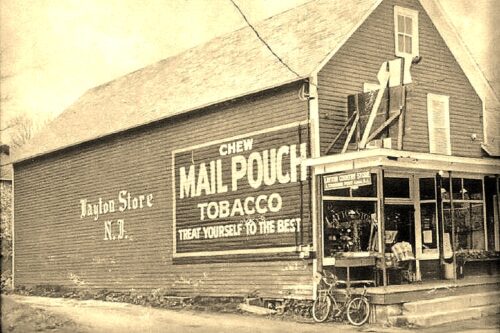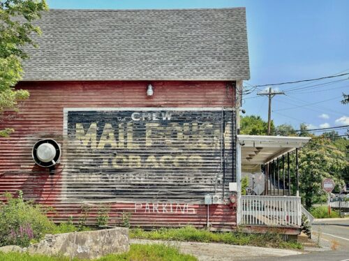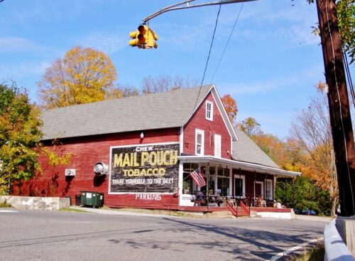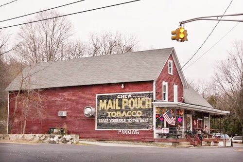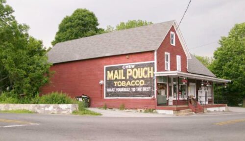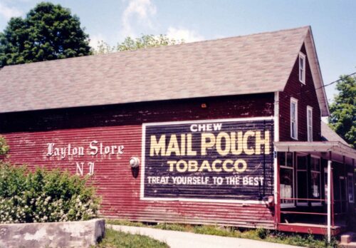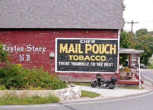 At the CR 560 (Tuttles Corner Dingmans Rd) & CR 540 (Bevans Road) intersection, in Layton. The Mail Pouch sign faces southwest. One side. Black background. Greatly faded.