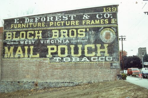 US Rt. 4 (Broadway) southeast of the Terminal Ln/East St. intersection by about 115'. The three-story brick building is on the southwest side of US Rt. 4. The MP sign faces southeast. One side. Brick building. Black.