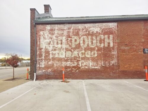 W. Market St. west of OH Rt. 57 (N. Main St.), in Orrville, by about 500'. The building is across from the intersection with Liberty, which is the entrance off of W. Market St. into the parking lot. The one story brick building is on the right side of the street headed west. The MP sign faces east. One side. Brick building. Original background color of the sign was black.. Greatly faded due to the whitewash.