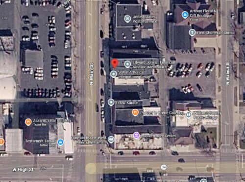 The Ohio Dept. of Transportation (ODOT) aerial views of the area around Bryan, Ohio were searched back to the 1940's; however, there were no aerial images of the building side.