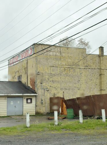 PA-255, north of intersection with PA-555 by about 1 mile. On PA-255 (Bennetts Valley Way), in Byrnedale. Going south on PA-155, the building is approximately 200 ft. south of the intersection with Cleveland Street. Building is on the right side. Sign faces northwest. Almost completely washed away.