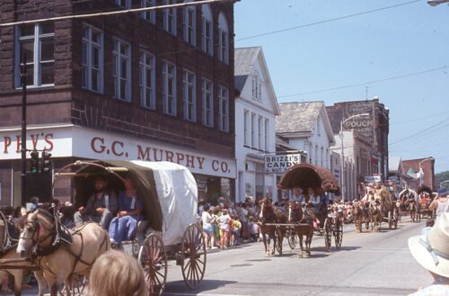 *GONE (razed and removed)* E. Market St. (old US Rt. 22), in Blairsville, east of S. Walnut St. by about 90'. The three-story brick building was on the right side of the street headed east. The MP sign faced west. Two sides. three-story brick building. Original Black background.