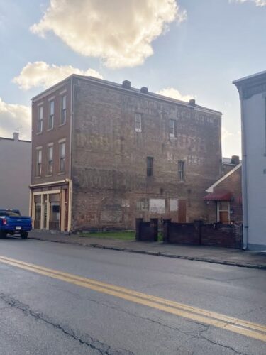 Along the west side of Jacob St. just south of 35th St., in Wheeling, by 185'. The three-story brick building is on the right side of the street headed south. The Mail Pouch sign faces north. One side. Original black background. Greatly faded.